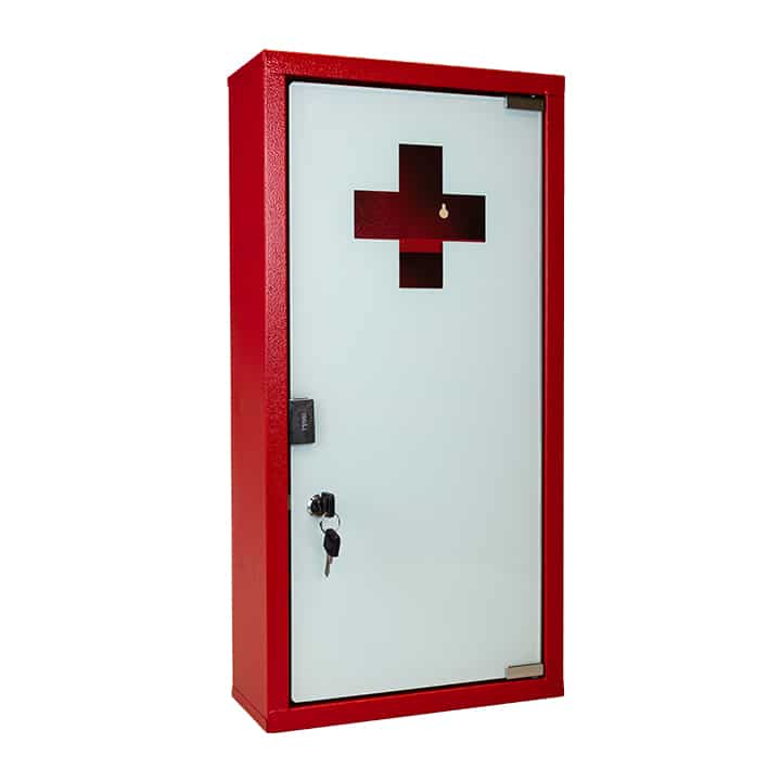 Armoire à pharmacie rouge avec une porte en verre trempée blanche.